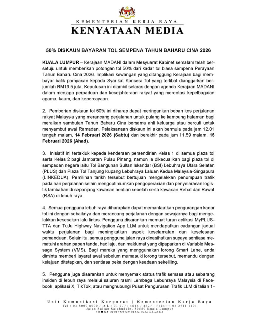 Mesyuarat Jemaah Menteri baru-baru ini secara rasmi bersetuju untuk memberikan insentif diskaun tol sebanyak 50 peratus sempena sambutan Tahun Baharu Cina 2026