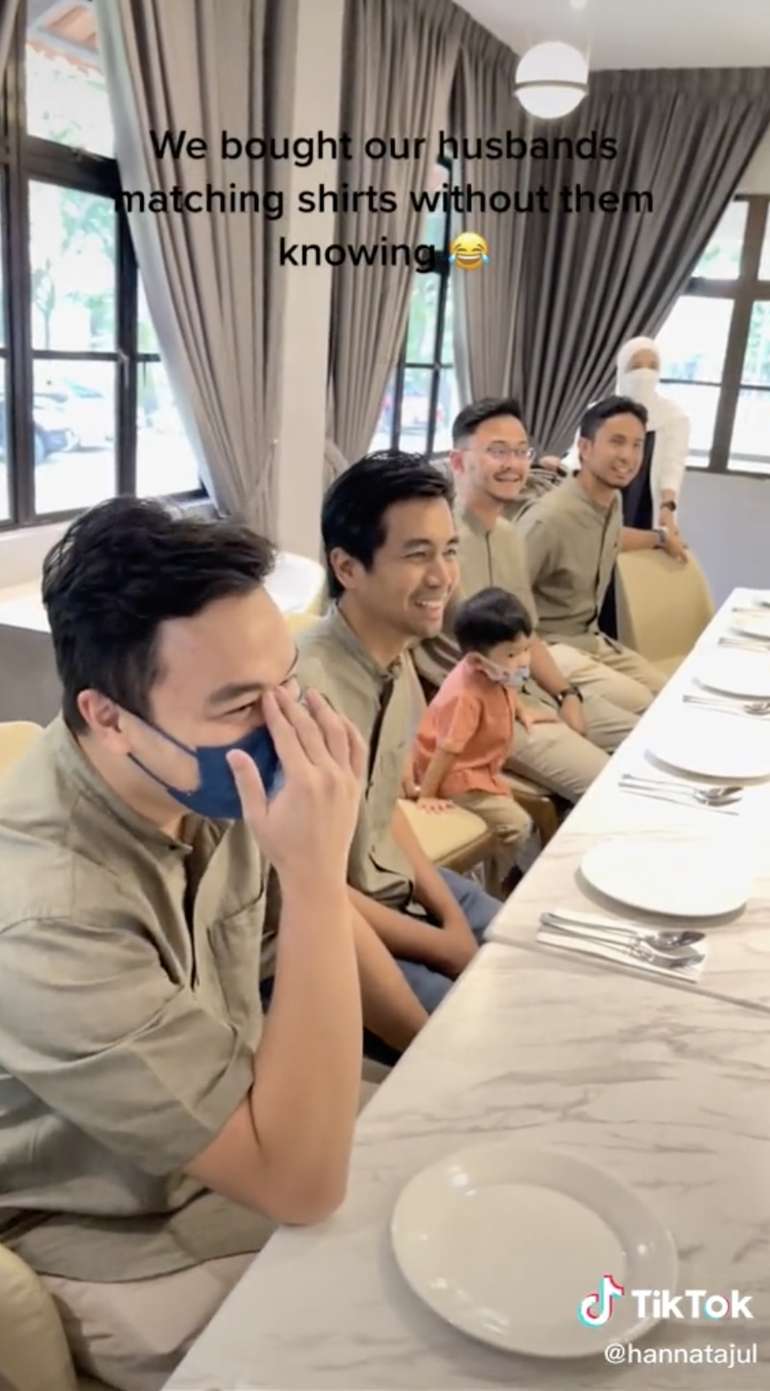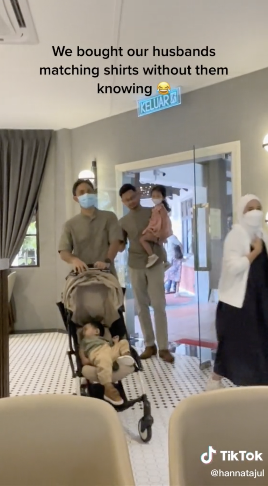 Rupa-rupanya, pihak suami mendapati baju mereka semua sama setibanya di kedai tersebut. Situasi itu membuatkan mereka semua tergelak dan tersenyum melihat sesama sendiri.