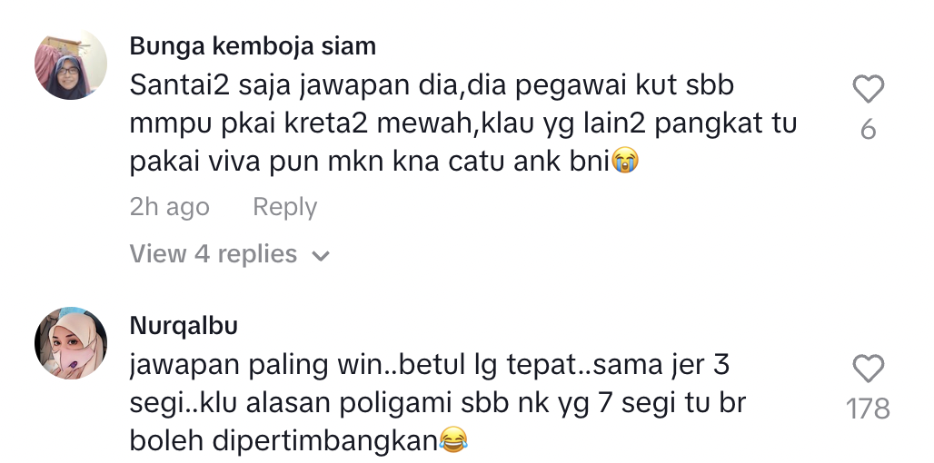 Dalam pada itu, tinjauan di ruangan komen mendapati rata-rata netizen turut memberikan pelbagai reaksi mereka selepas mendengar jawapannya.
