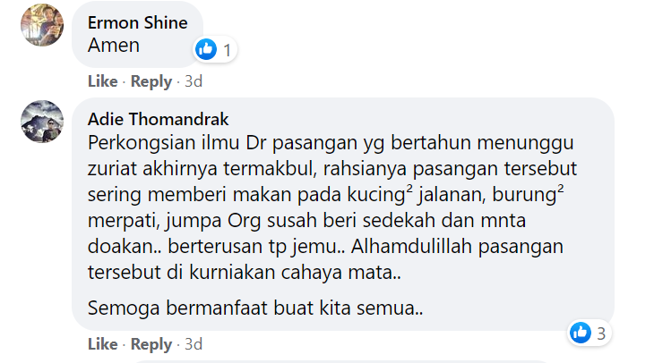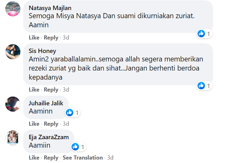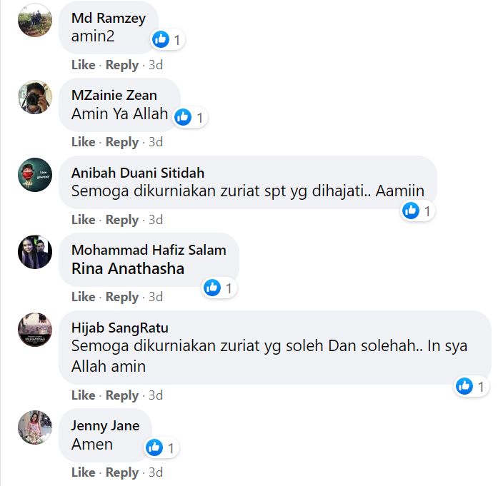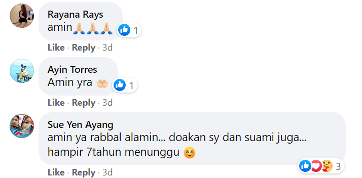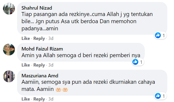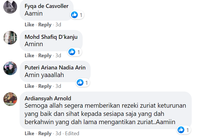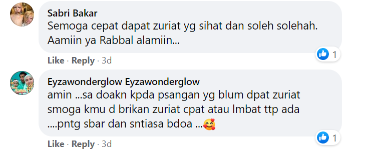 Dalam pada itu, tinjauan di ruangan komen juga menunjukkan rata-rata netizen turut mendoakan pasangan tersebut dan memberikan kata-kata positif