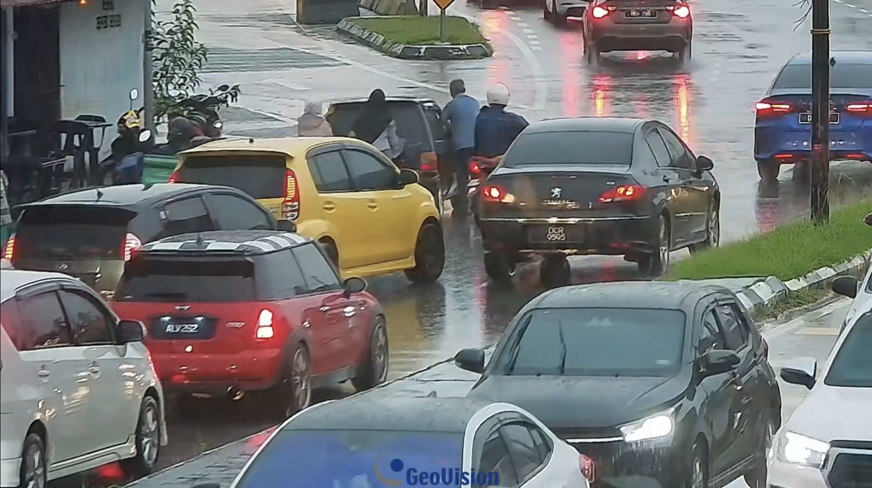 Walaupun hujan sedang turun, mereka terus ke arah kereta tersebut dan membantu lelaki warga emas itu menolak kenderaannya ke tepi jalan.