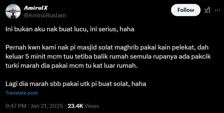 Menerusi perkongsian @AmirulRuslam di X, dia menceritakan bagaimana budaya memakai kain pelekat masih lagi tidak diterima di sana.