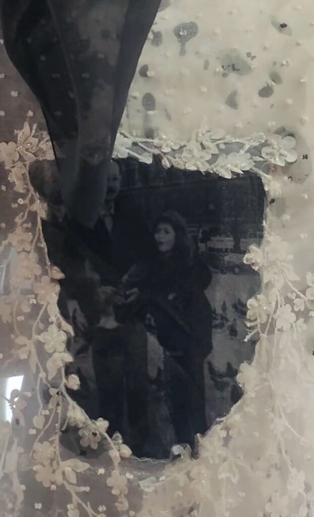 Menerusi perkongsian video di TikTok @ajim_salleh, busana yang direka oleh Zaimi Zulkafli itu menunjukkan gambar Fazura bersama arwah bapanya di bahagian veil.