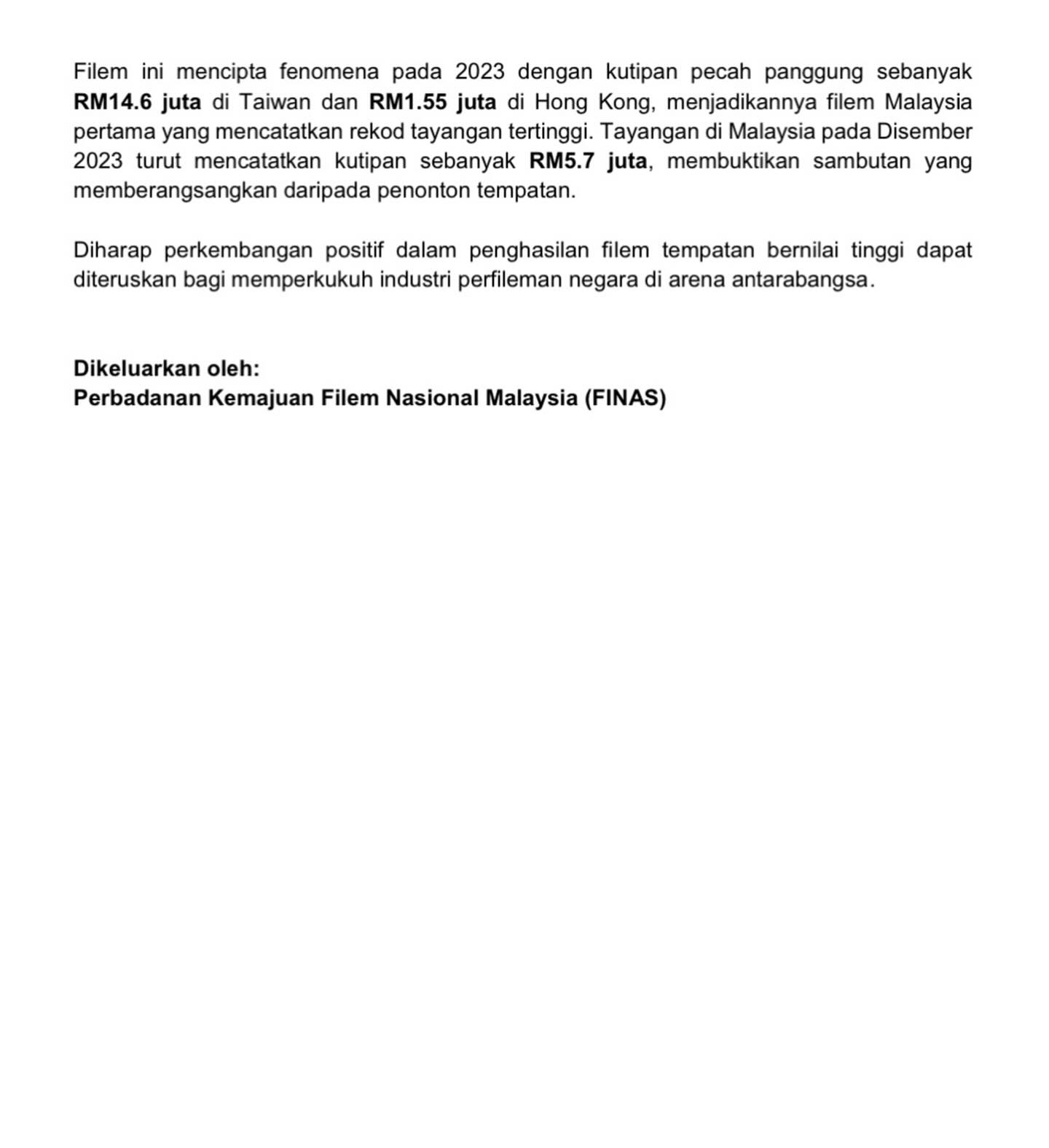 Berita itu dikongsikan oleh Perbadanan Kemajuan Filem Nasional Malaysia (FINAS).