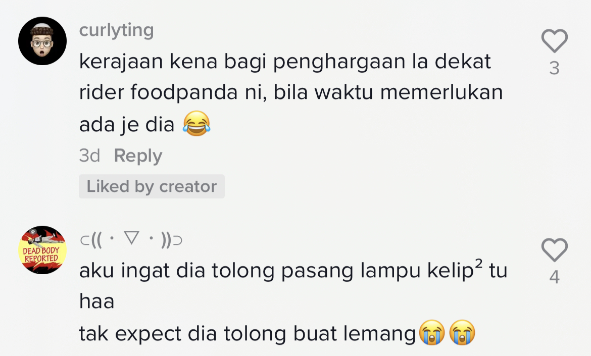 Dalam pada itu, tinjauan di ruangan komen mendapati rata-rata netizen turut terhibur melihat situasi abang foodpanda membantu membuat persiapan raya tersebut.