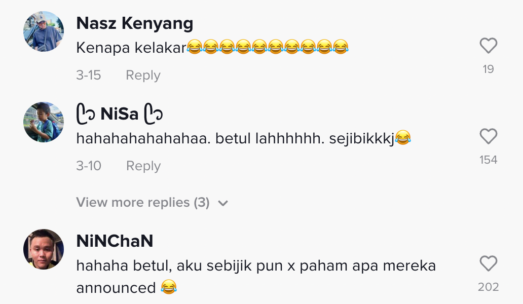 "Hahaha betul aku sebiji pun tak faham apa mereka announced" – Netizen