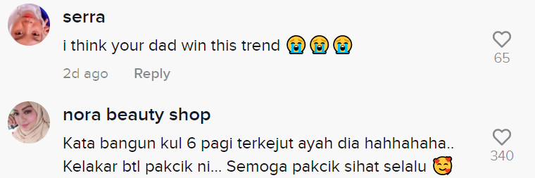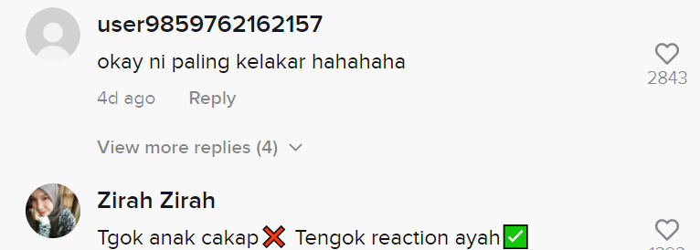 Sementara itu, tinjauan di ruangan komen mendapati rata-rata netizen turut terhibur melihat gelagat keluarga tersebut. Malah, ramai yang menganggap reaksi si ayah sangat spontan dan bersahaja ketika mendengarnya.