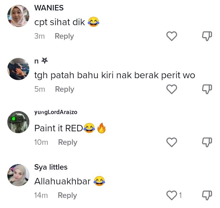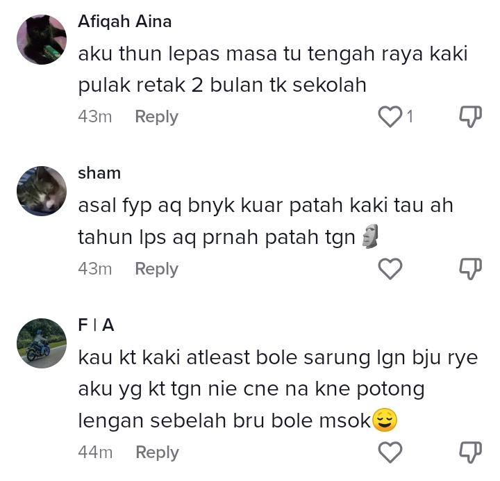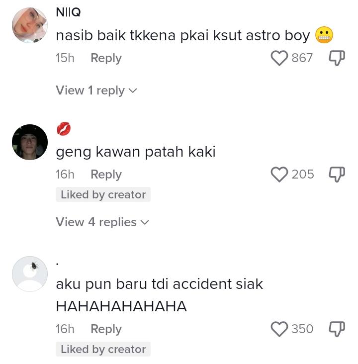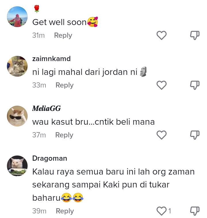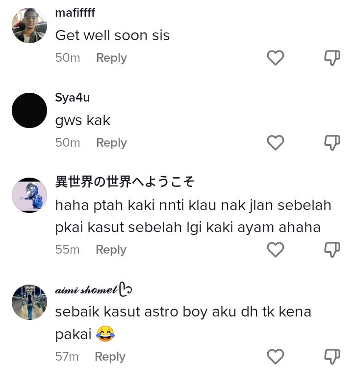 Dalam pada itu, tinjauan di ruangan komen mendapati rata-rata netizen turut memberi komen yang mencuit hati mengenai kejadian tersebut. Ada juga yang bersimpati dan mendoakan kesembuhan kakinya.