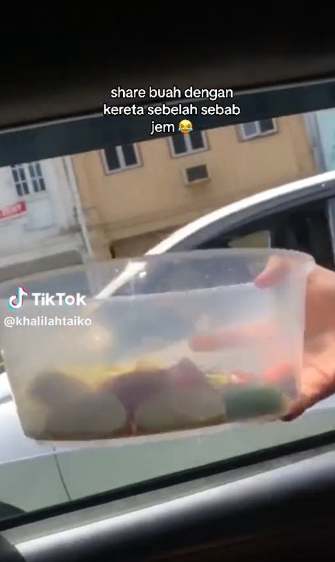 Hal itu membuatkan dia dan kawan-kawannya yang berada di dalam kereta tergelak kerana terhibur dengan tindakan mereka yang berkongsi buah itu.