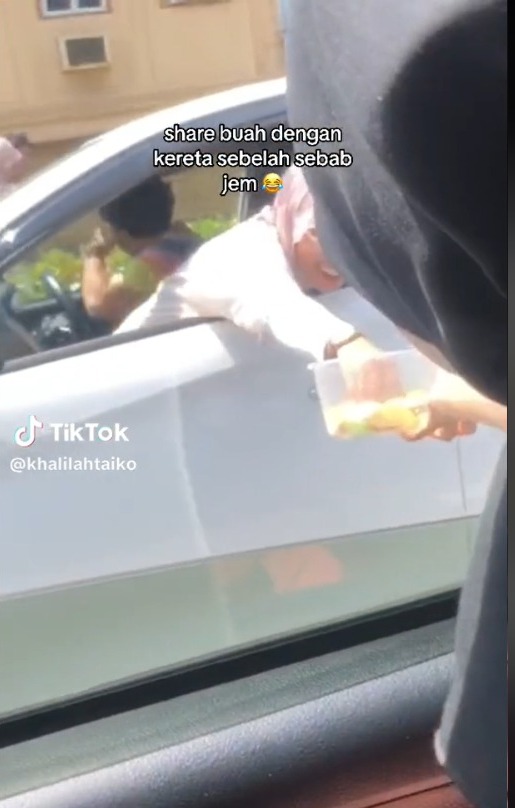 Menerusi video yang dimuat naik oleh @khalilahtaiko di TikTok, kelihatan seorang gadis sedang berusaha untuk memberikan buah epal yang sudah dipotong kepada kereta di sebelahnya.