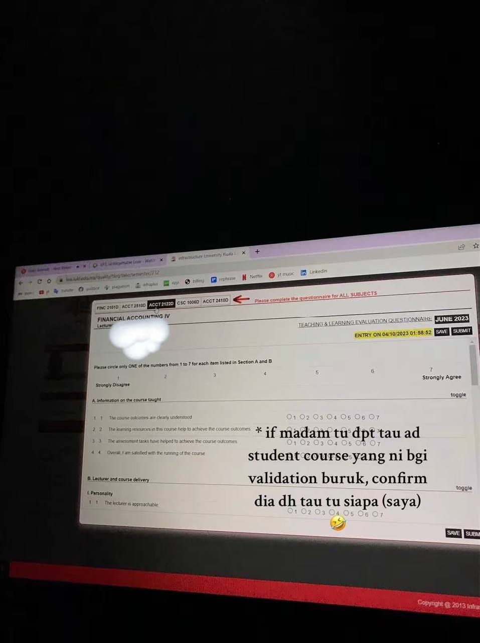 Dalam pada itu, dia memaklumkan penilaian pengajaran dan pembelajaran yang perlu diisi secara anonymous sudah pasti dapat diketahui siapa yang mengisinya kerana hanya dia seorang sahaja ada di dalam kelas tersebut.