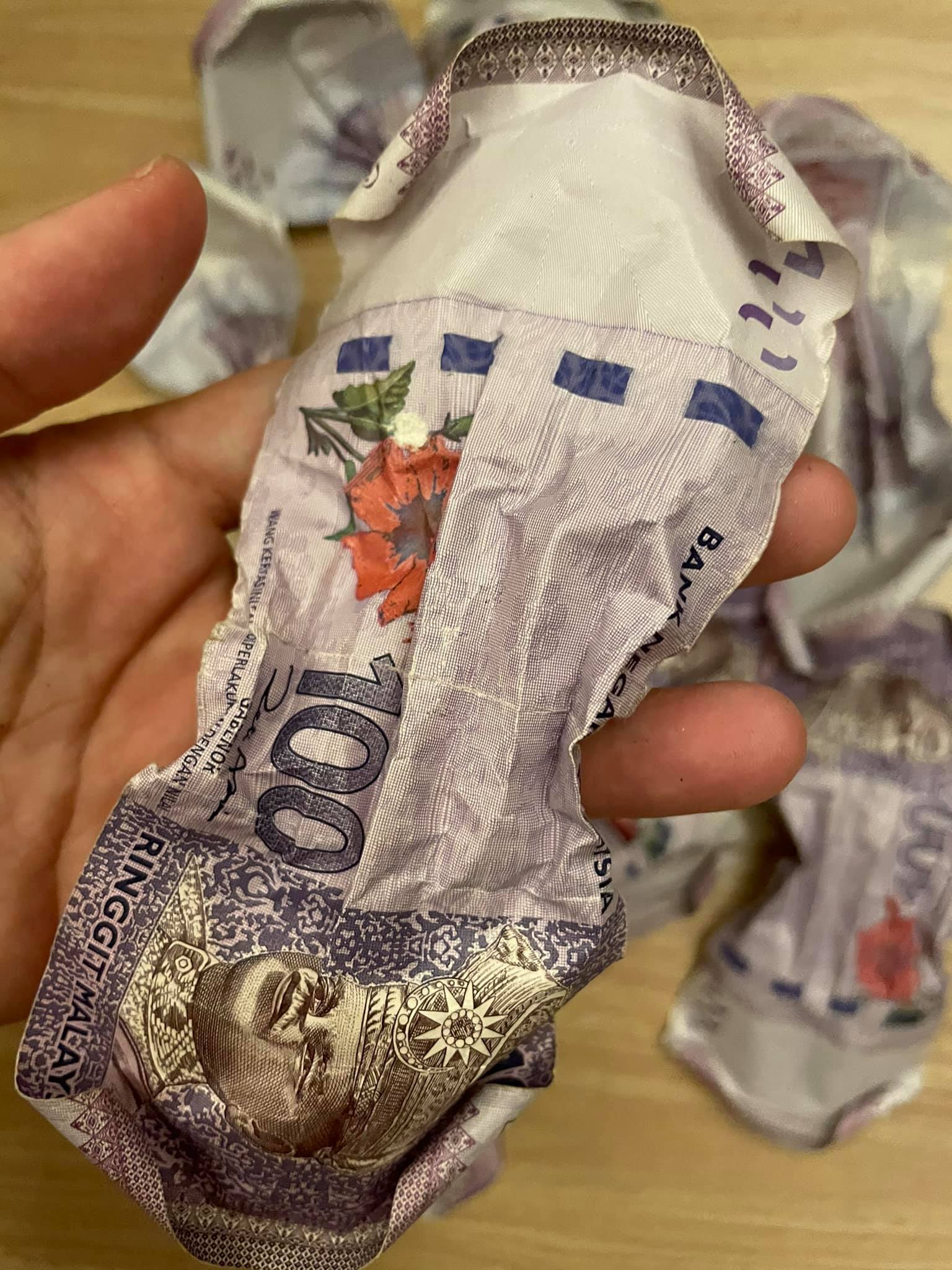 Dia amat terkejut selepas melihat semua kepingan wang kertas itu berada dalam keadaan renyuk. Apa yang lebih menyedihkan adalah ada sesetengah daripada duit tersebut terkoyak kerana dilekatkan dengan gam.