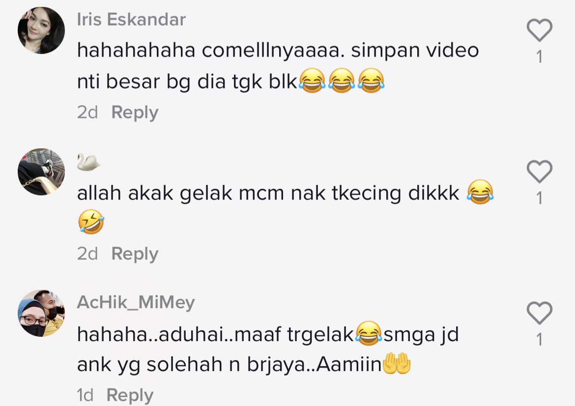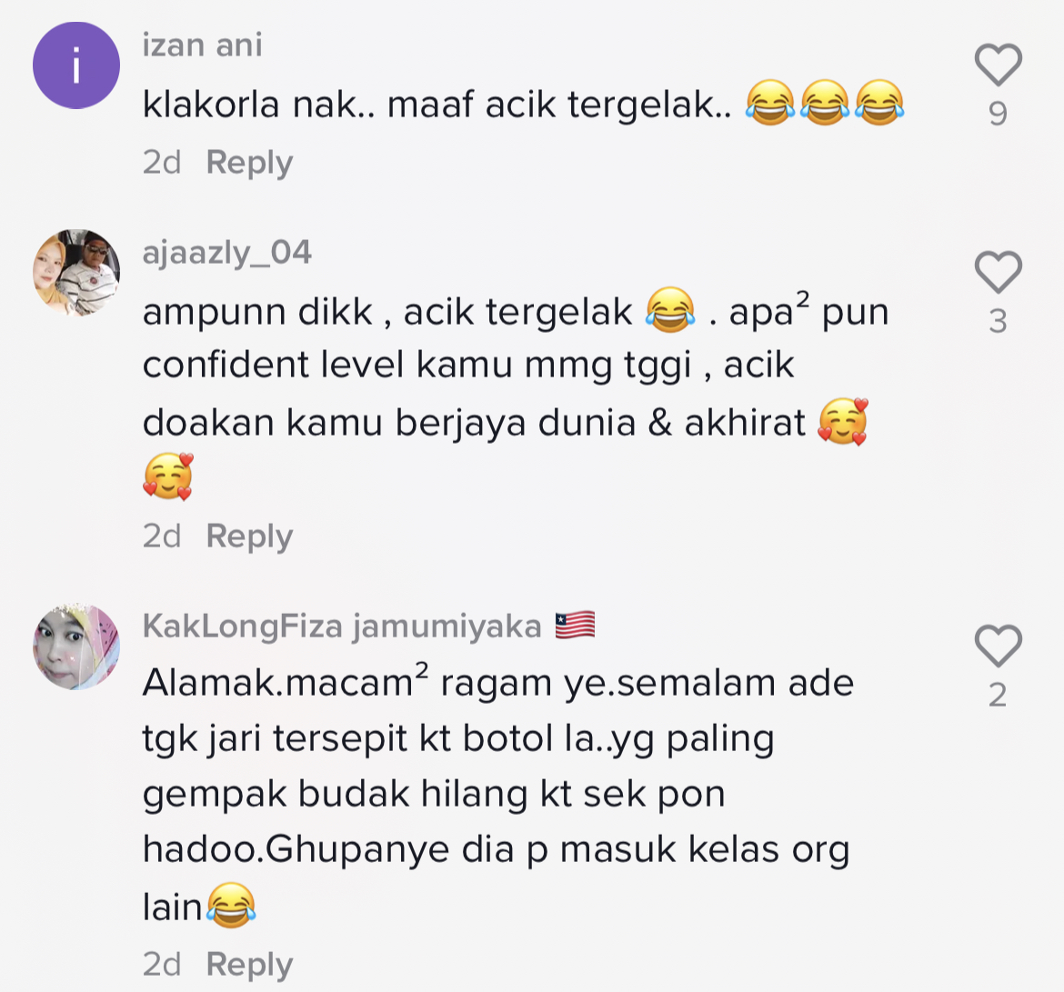"Ampun dik, mak cik tergelak. Apa-apa pun confident level kamu memang tinggi. Mak cik doakan kamu berjaya dunia dan akhirat" – Netizen