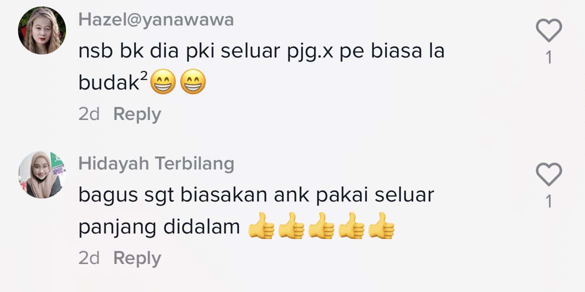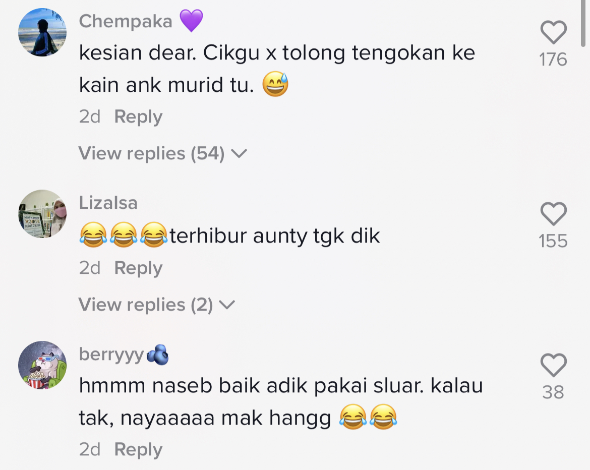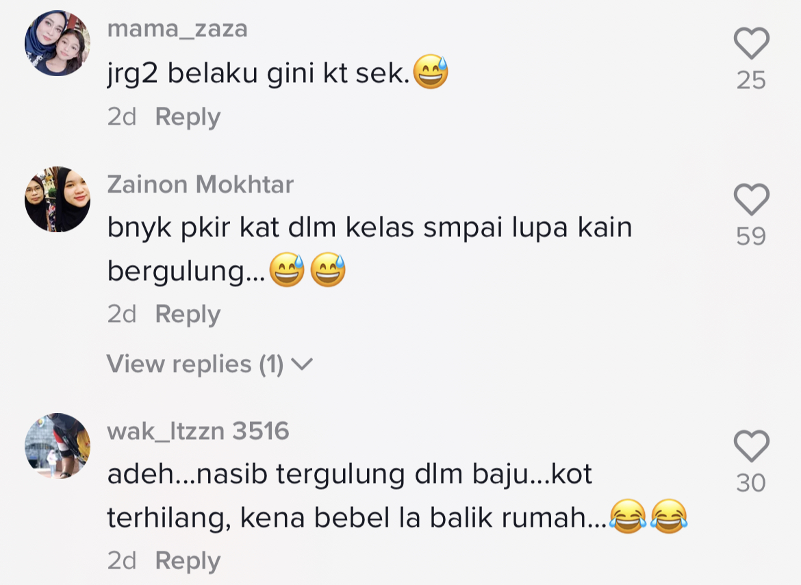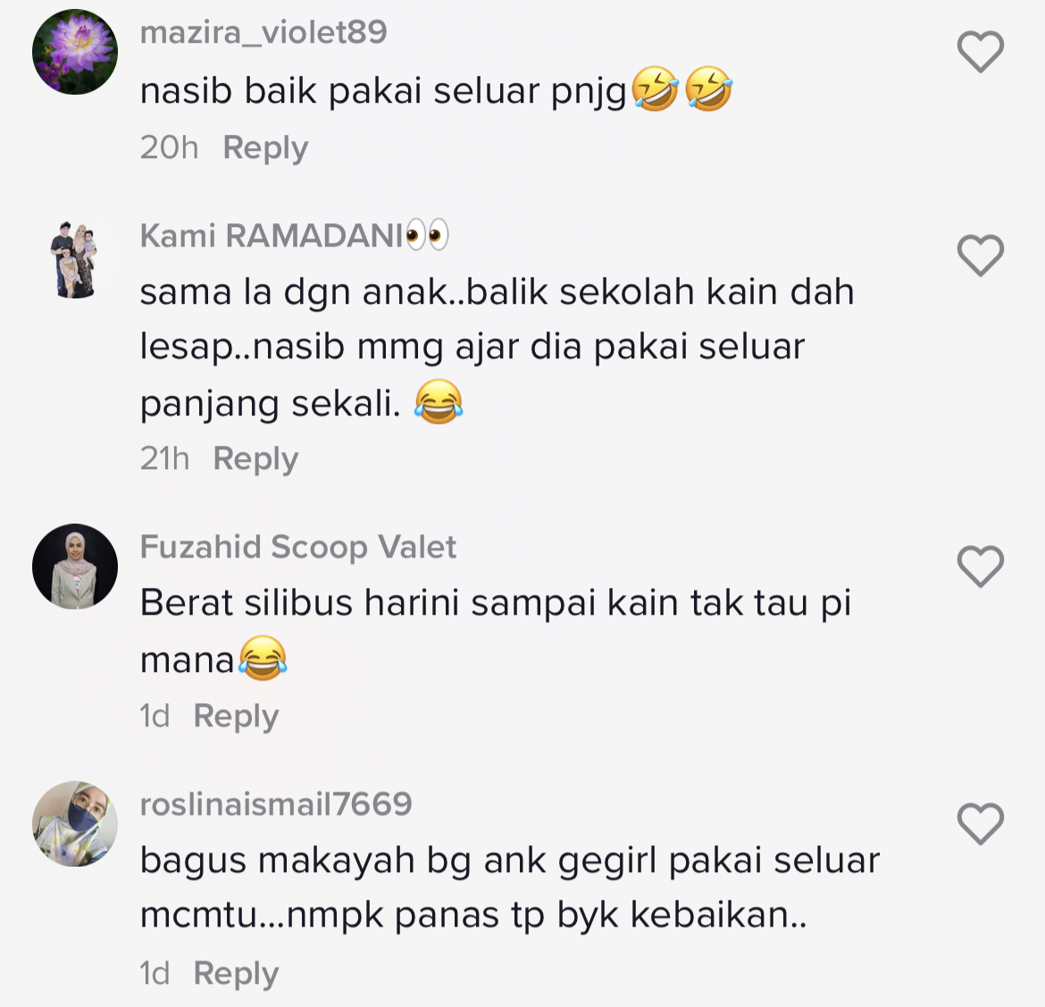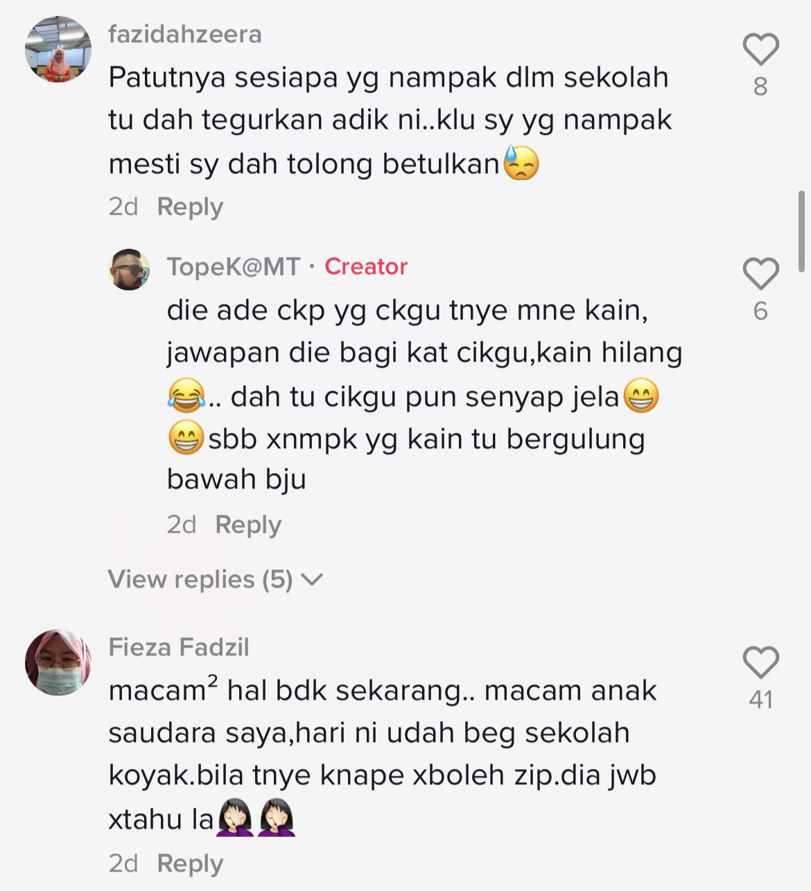 Susulan tularnya video berkenaan yang kini telah mendapat 269.4K views, 15.5K likes dan 1,248K comments di TikTok, rata-rata netizen turut terhibur dengan kejadian budak perempuan ini kehilangan kain sekolahnya.