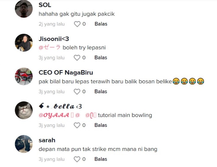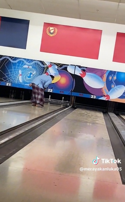 Menerusi video yang dimuat naik oleh @merayakanluka05 di TikTok, kelihatan seorang lelaki berbaju Melayu dan memakai kain pelikat sedang dirakam bermain boling ten-pin di sebuah pusat bowling.