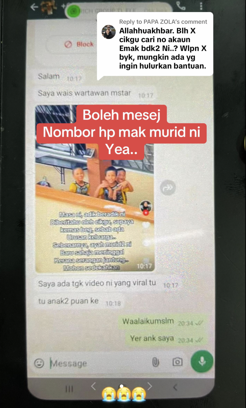 "Cikgu pun tak sampai hati nak beritahu perkara sebenar. Sehingga ada makcik murid ni yang datang ambil. Baru lah tahu perkara sebenar, meraung menagis. Ya allah kau berikan kekuatan buat anak murid Cikgu Ain, Azalea dan adik beradiknya," tulisnya.