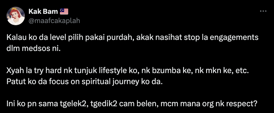 "Kalau kau dah level pilih pakai purdah, akak nasihat stop la engagements dalam medsos ni. Tak payah la try hard nk tunjuk lifestyle kau, nak berzumba ke, nak makan ke.