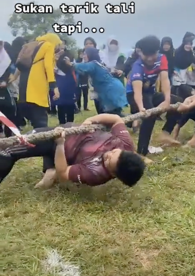 Menerusi video yang dimuat naik oleh @kmalhkim, kelihatan sedang berlangsungnya acara tarik tali di sebuah Hari Sukan yang tidak dikenal pasti.