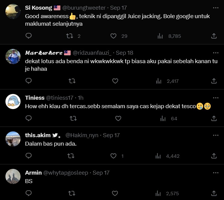Seorang lagi pengguna Twitter ada membalas dalam tweet yang sama mendedahkan proses pencurian data itu dipanggil Juice Jacking.