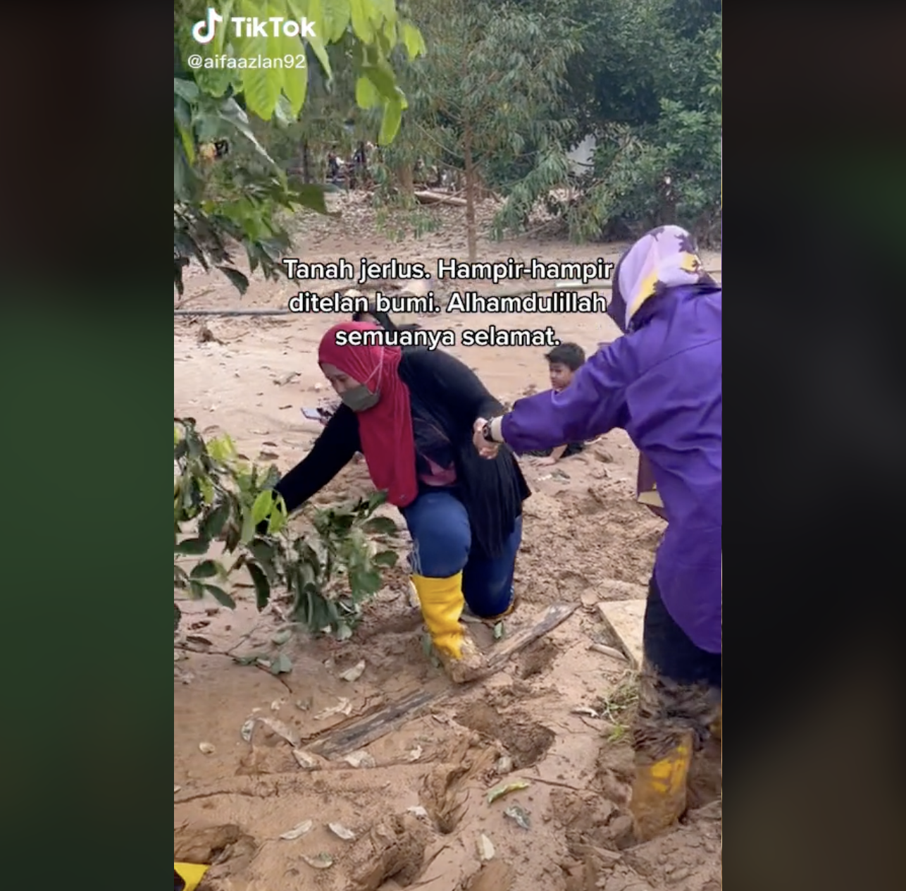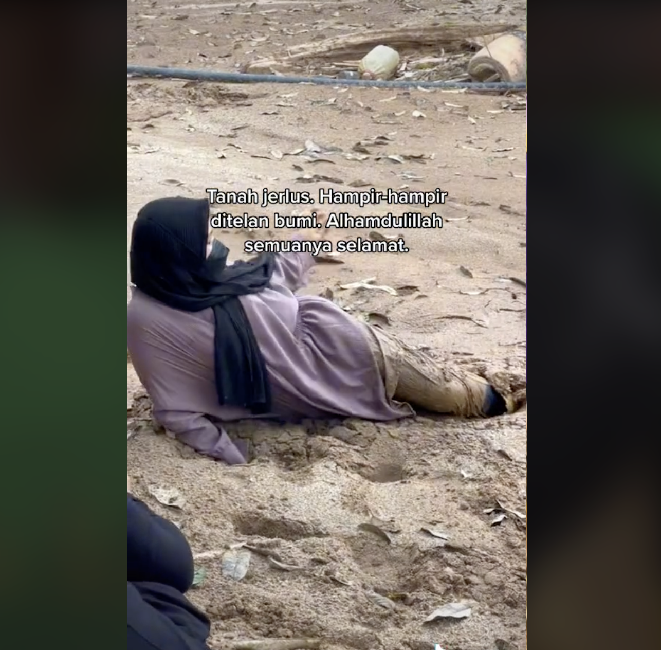 Menerusi video yang dimuat naik oleh @aifaazlan92, kelihatan dua orang wanita yang terperangkap dalam satu kejadian tanah jerlus.