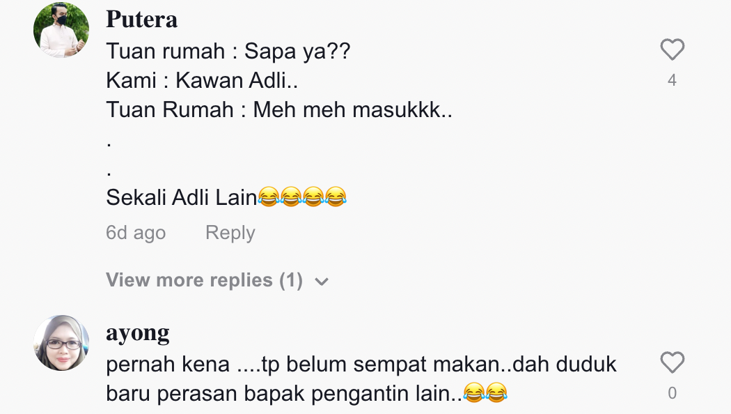 Lain pula dengan video di TikTok ini apabila sekumpulan lelaki merasa malu kerana tersalah pergi majlis kahwin rakan mereka telah mencuri tumpuan ramai.