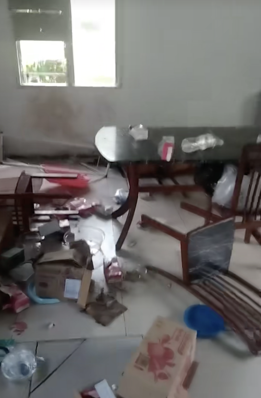 Bukan itu sahaja, dia juga berkongsi kerosakan lain antaranya di bahagian siling ruang tamu, makanan bersepah, barangan yang jatuh dan sampah berterabur di lantai.