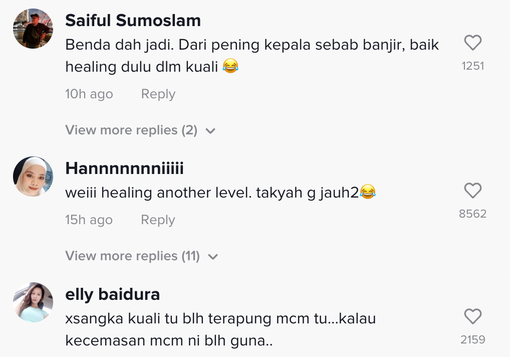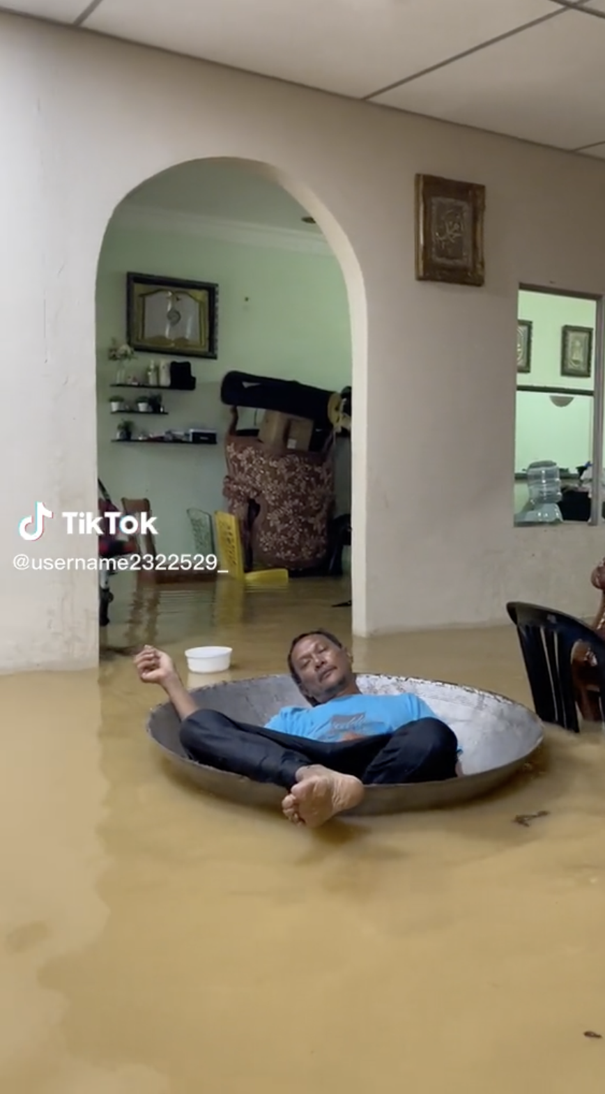 Lain pula dengan video yang tular di TikTok ini apabila seorang lelaki dilihat bersantai di dalam sebuah kuali semasa banjir telah mencuri tumpuan ramai.