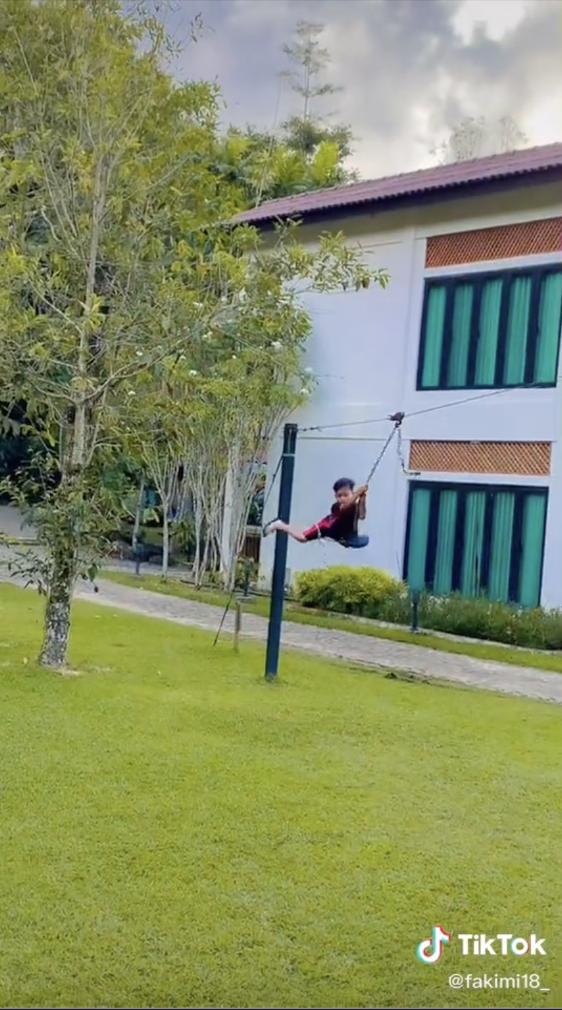 Menerusi video yang dimuat naik oleh @fakimi18_ di TikTok, kelihatan seorang budak lelaki sedang bermain flying fox di sebuah tempat yang tidak dikenal pasti.