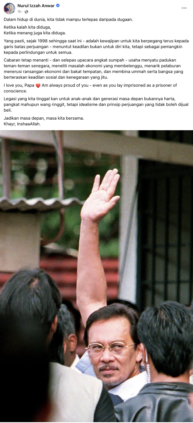"Saya sayang Papa, sentiasa bangga dengan Papa walaupun dipenjara sebagai banduan politik" demikianlah luahan Naib Presiden PKR Nurul Izzah Anwar di laman Facebooknya