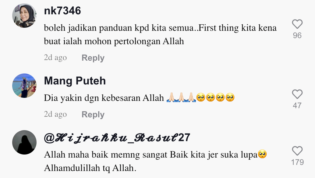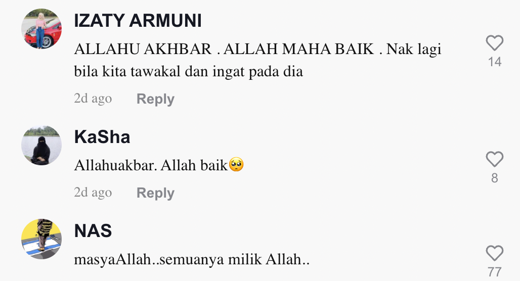 "Allah maha baik. Nak lagi bila kita tawakal dan ingat pada dia" – Netizen