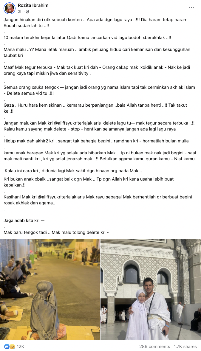 "Jangan malukan Mak kri @aliffsyukriterlajaklaris delete lagu tu, mak tegur secara terbuka! Kalau kamu sayang mak delete – stop – hentikan selamanya jangan ada lagi lagu raya.