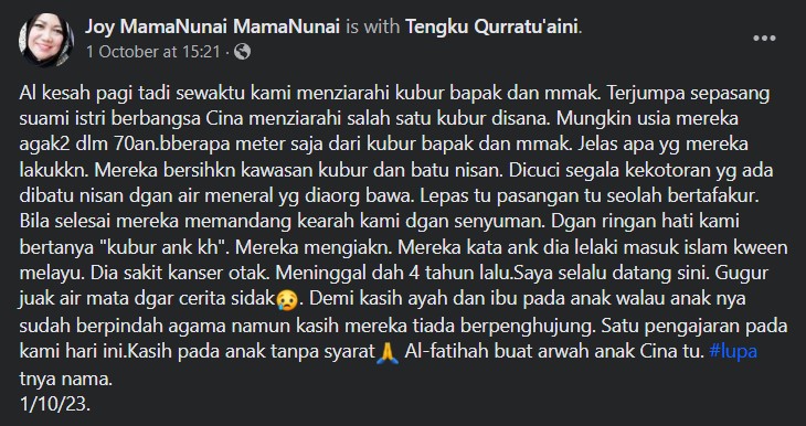 Namun begitu, bukan semua yang diperkatakan itu benar. Perkara ini dapat dilihat menerusi sebuah hantaran yang tular di Facebook memaparkan sepasang suami isteri berbangsa Cina melawat kubur anak lelakinya yang memeluk Islam.