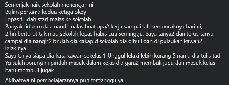 Namun perkara itu berubah sejak anak kepada ibu tersebut masuk ke sekolah menengah di mana dia dilihat sudah mula malas ke sekolah.