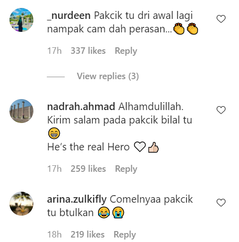 Dalam pada itu, tinjauan di ruangan komen mendapati rata-rata netizen memuji tindakan pak cik tersebut yang pantas menyelesaikan masalah. Malah, ada juga memuji kecomelan gelagat pak cik itu.