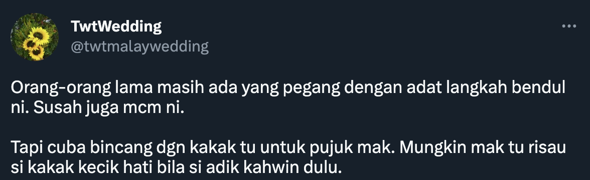 "But the problem is mak I tak bagi langkah bendul. Kakak saya tak kahwin lagi and tak ada nampak bayang BF pun," luahnya.