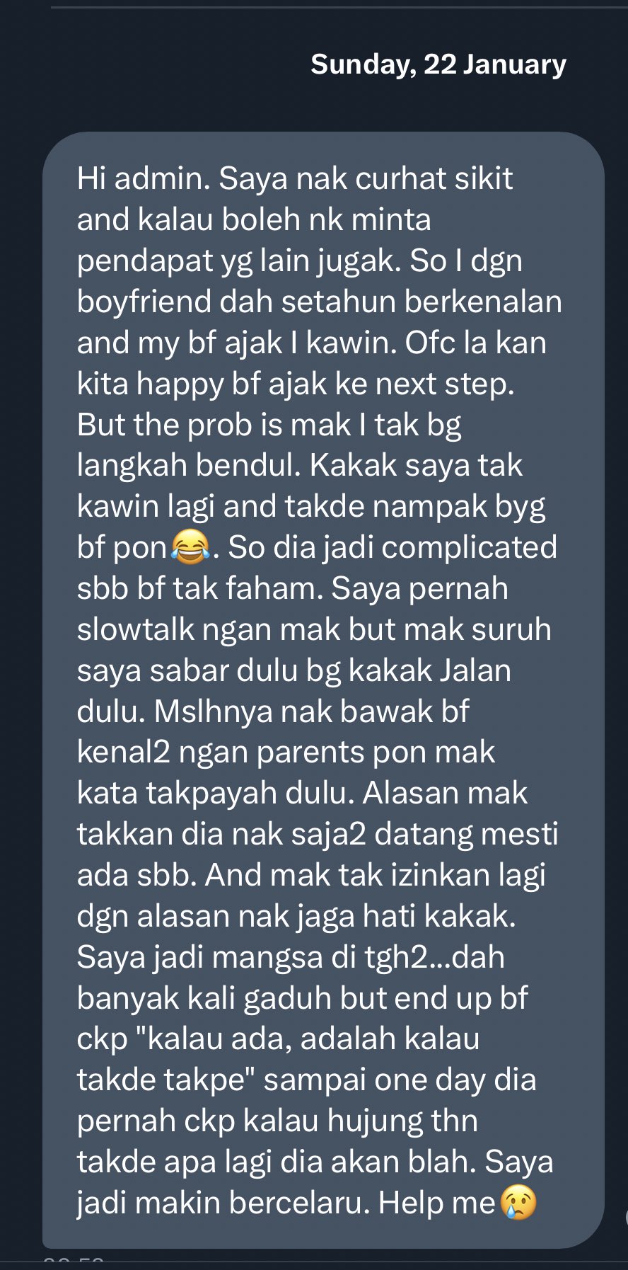 Namun, disebalik kegembiraan itu, wanita berkenaan berkongsi masalah yang perlu dihadapinya di dalam keluarganya. Dia menjelaskan pada teman lelakinya bahawa ibunya tidak mengizinkan untuk berkahwin selagi si kakak tidak menjumpai jodohnya.