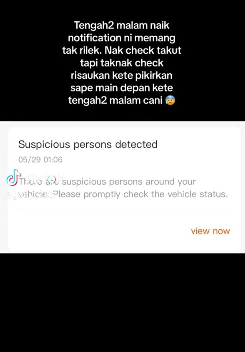 Dalam video itu dapat dilihat dia telah mendapat notification berkenaan orang yang mencurigakan telah dikesan oleh dashcam nya pada waktu tengah malam. Ia membuatkan dia amat takut untuk memeriksa namun kerana memikirkan keretanya, dia telah bertindak melihatnya juga.