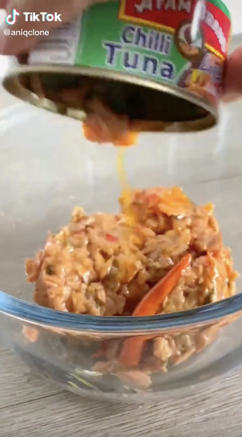 1. Masukkan dua tin chilli tuna ke dalam mangkuk.