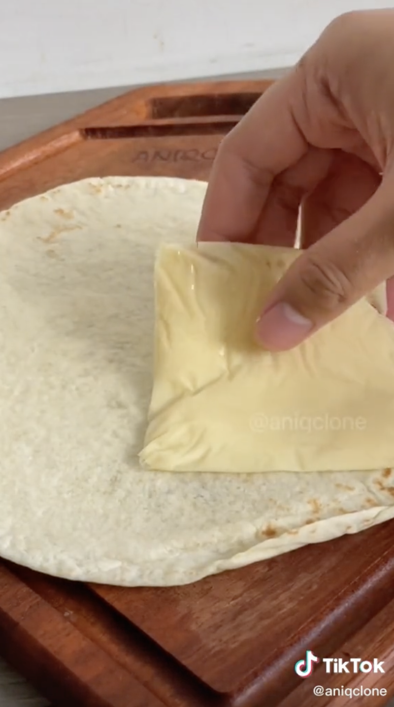 6. Untuk wrap pula, sediakan tortilla wrap dan letakkan dua keping cheese atau lebih mengikut cita rasa anda.