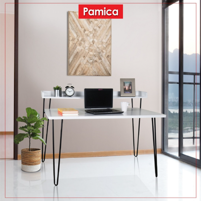 Meja ini sesuai untuk ruang yang lebih kecil kerana tapaknya. Ia juga menawarkan dua tingkat ruang meja dengan tambahan riser. Warna putih yang bersih dan design kaki meja logam membuatkan binaan meja ini kukuh dan reka bentuk yang menarik.