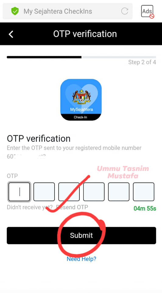Selepas saja anda mendaftarkan nombor telefon, anda akan mendapat nombor OTP untuk pengesahan melalui SMS. Masukkannya dan tekan submit.