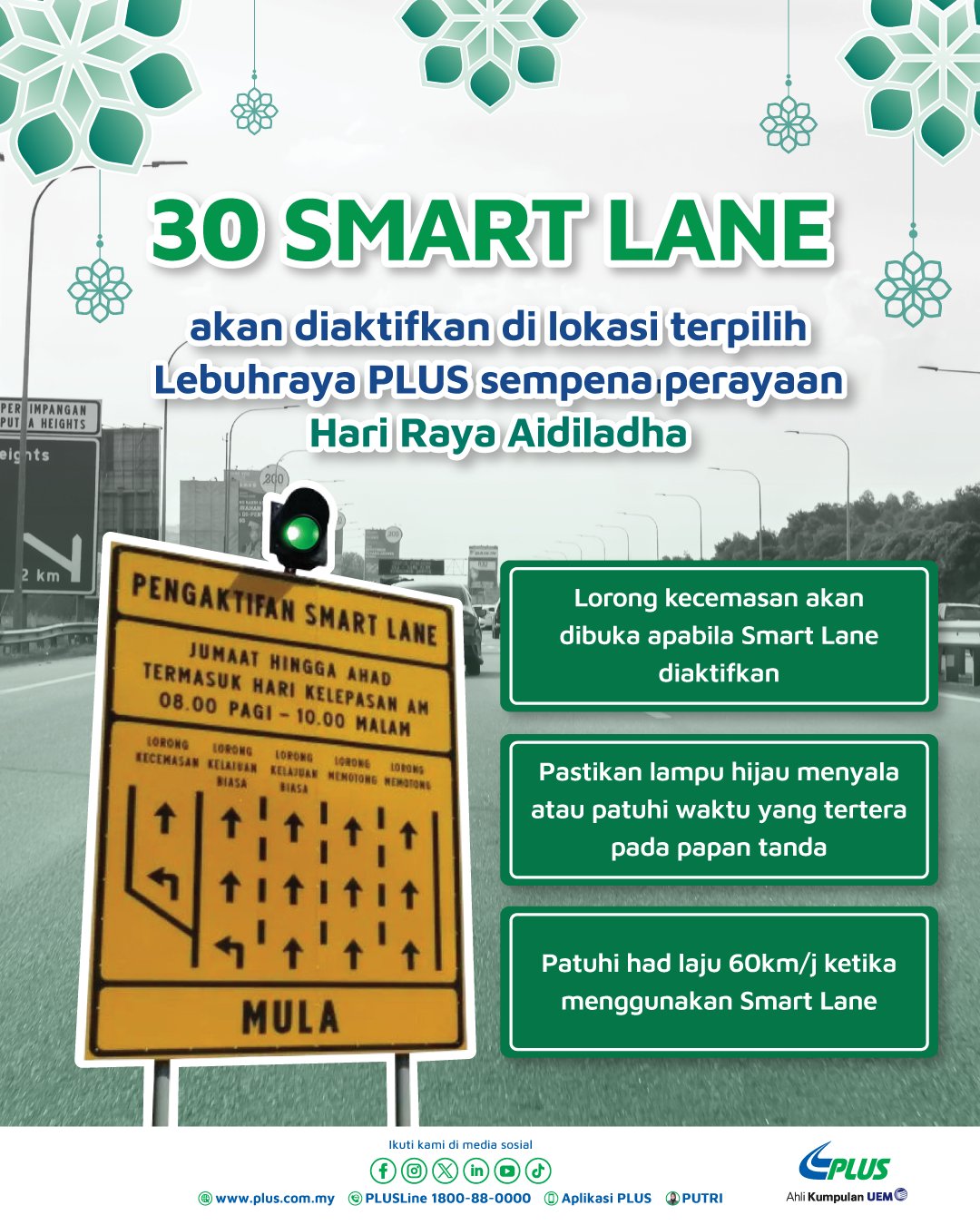 "Sempena musim perayaan Hari Raya Aidiladha yang bakal menjelma, PLUS Malaysia Berhad akan mengaktifkan 30 lokasi Smart Lane di sepanjang Lebuhraya PLUS sebagai salah satu inisiatif untuk menyuraikan trafik dan menambah kapasiti lorong di lebuh raya.