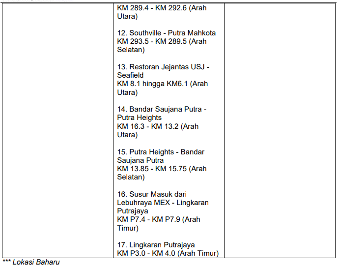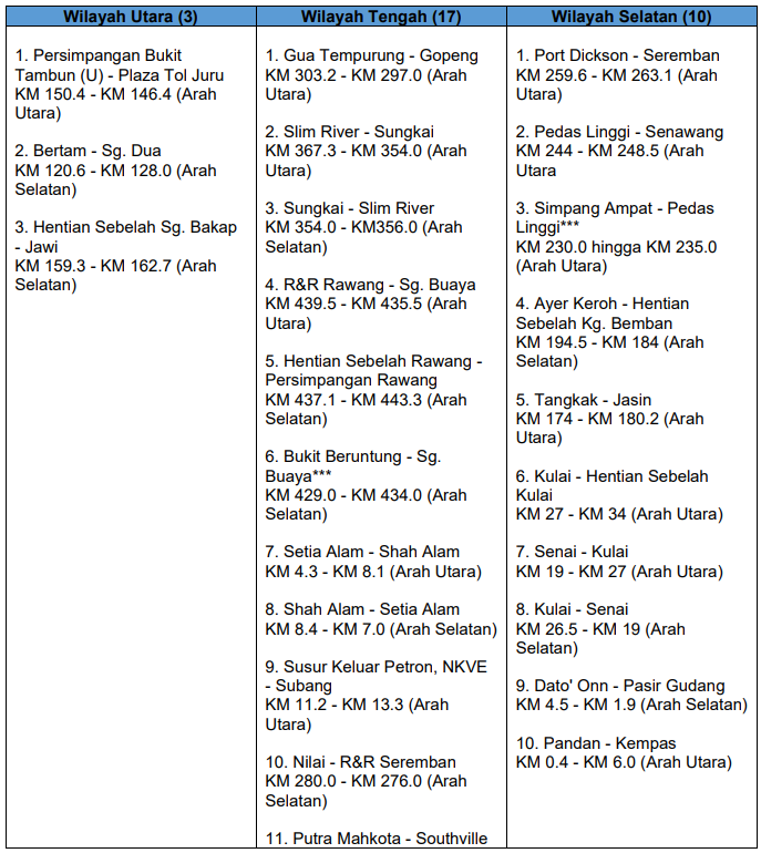 Ini senarai penuh 30 lokasi Smart Lane yang diaktifkan pada musim perayaan ini: