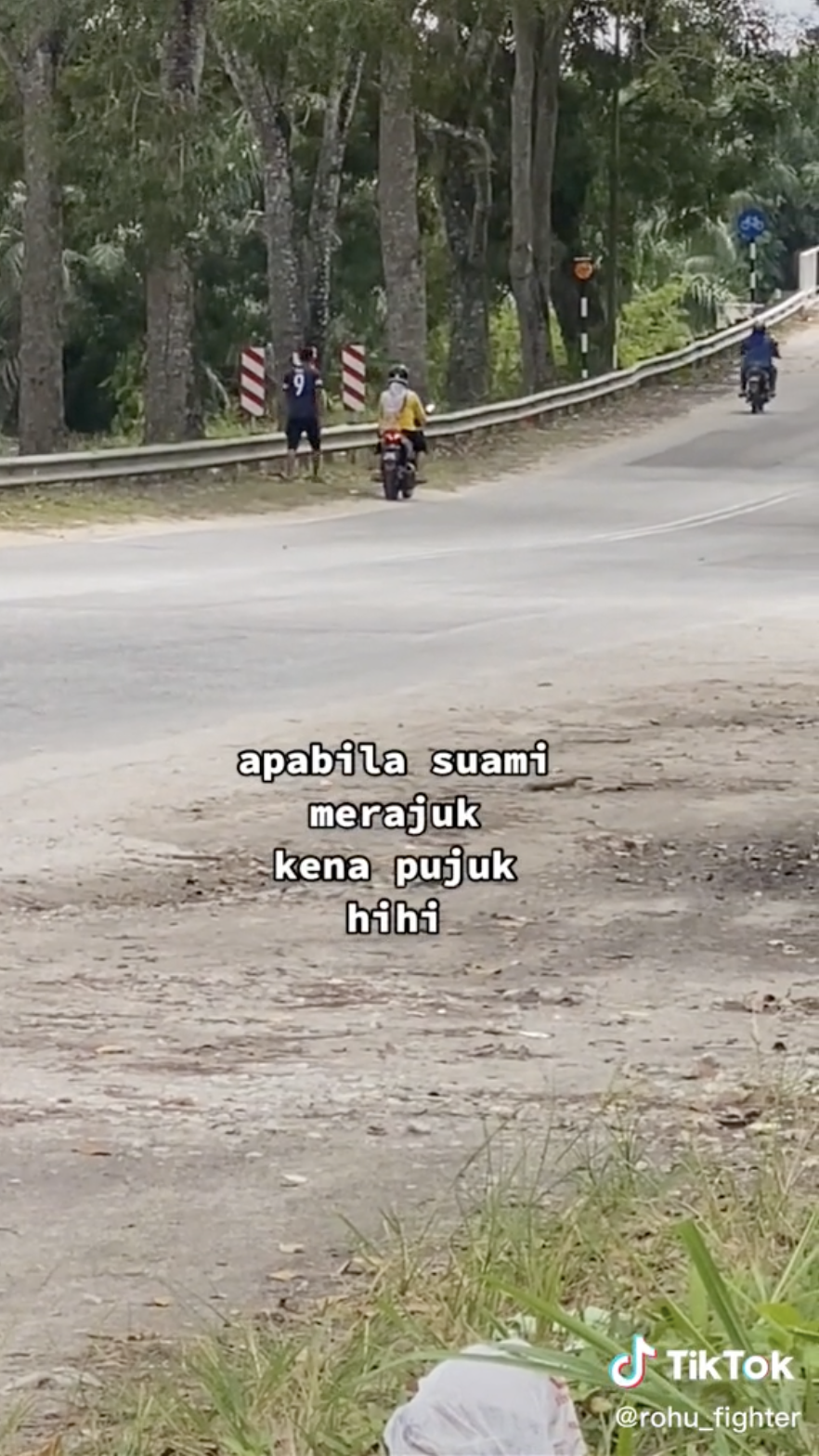 Dapat dilihat lelaki itu berjalan seorang diri di tepi jalan. Namun, apa yang lebih menarik perhatian adalah kelihatan seorang wanita yang sedang menunggang motosikal itu seolah-olah sedang memujuk pasangannya.