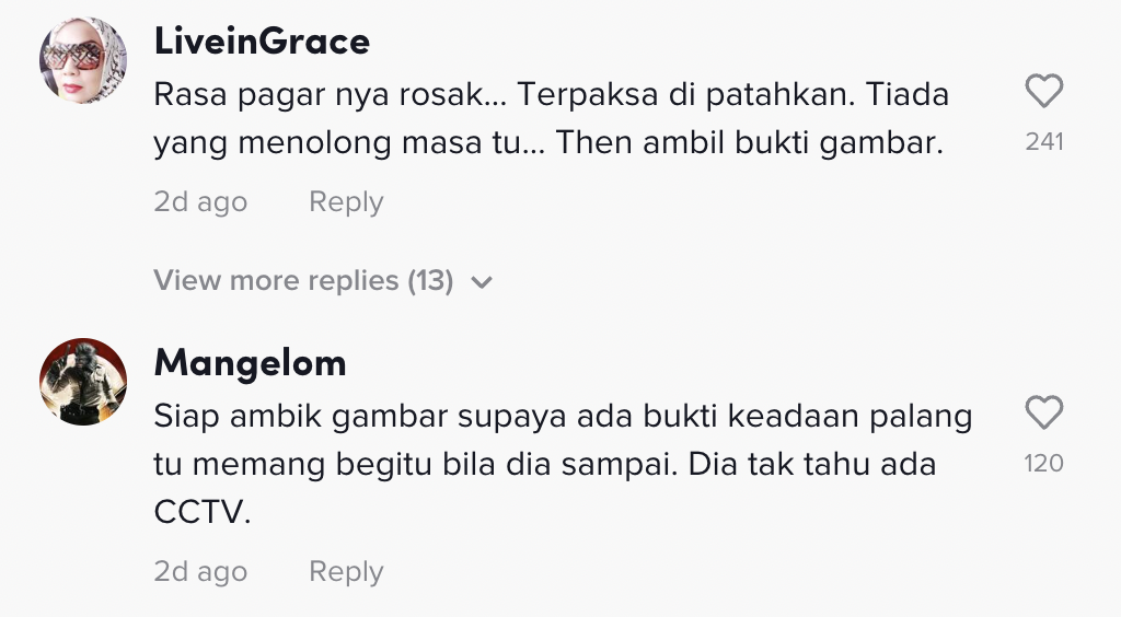 "Rasa pagarnya rosak. Terpaksa dipatahkan. Tiada yang menolong masa tu. Then ambil bukti gambar" – Netizen