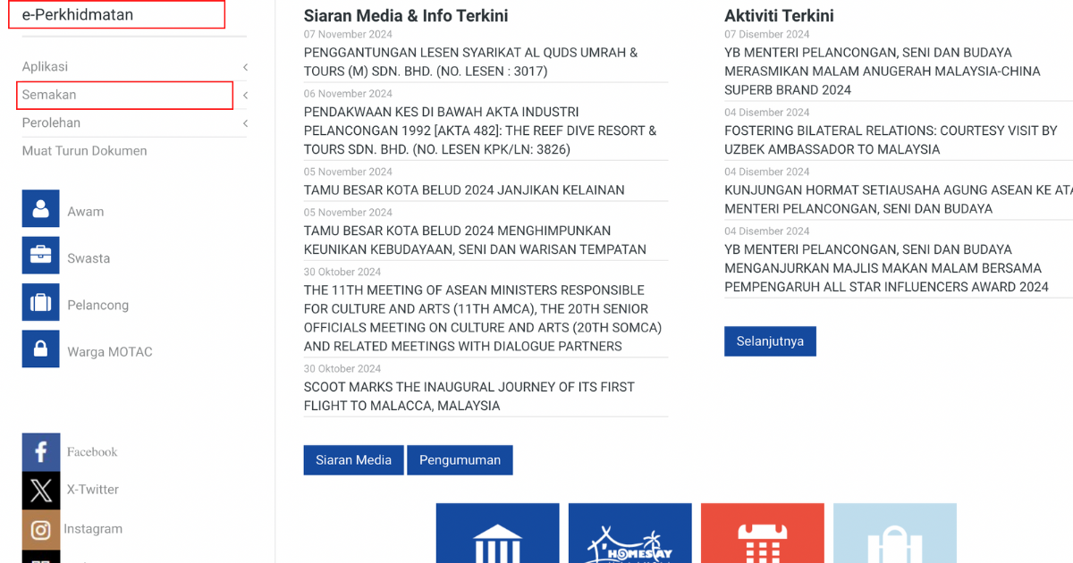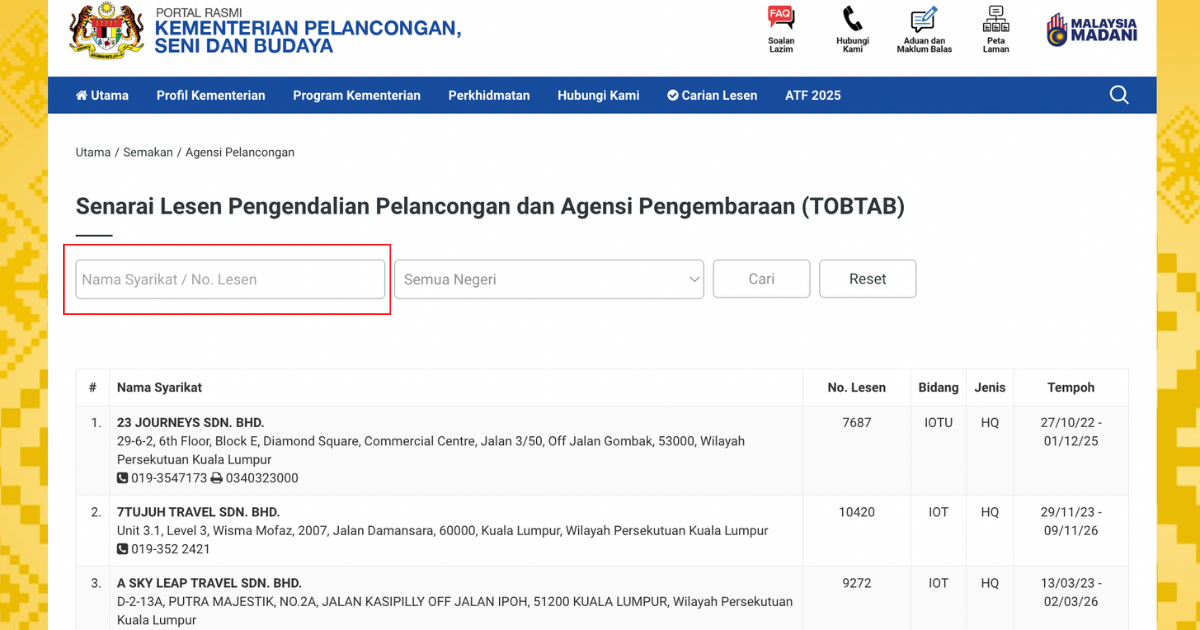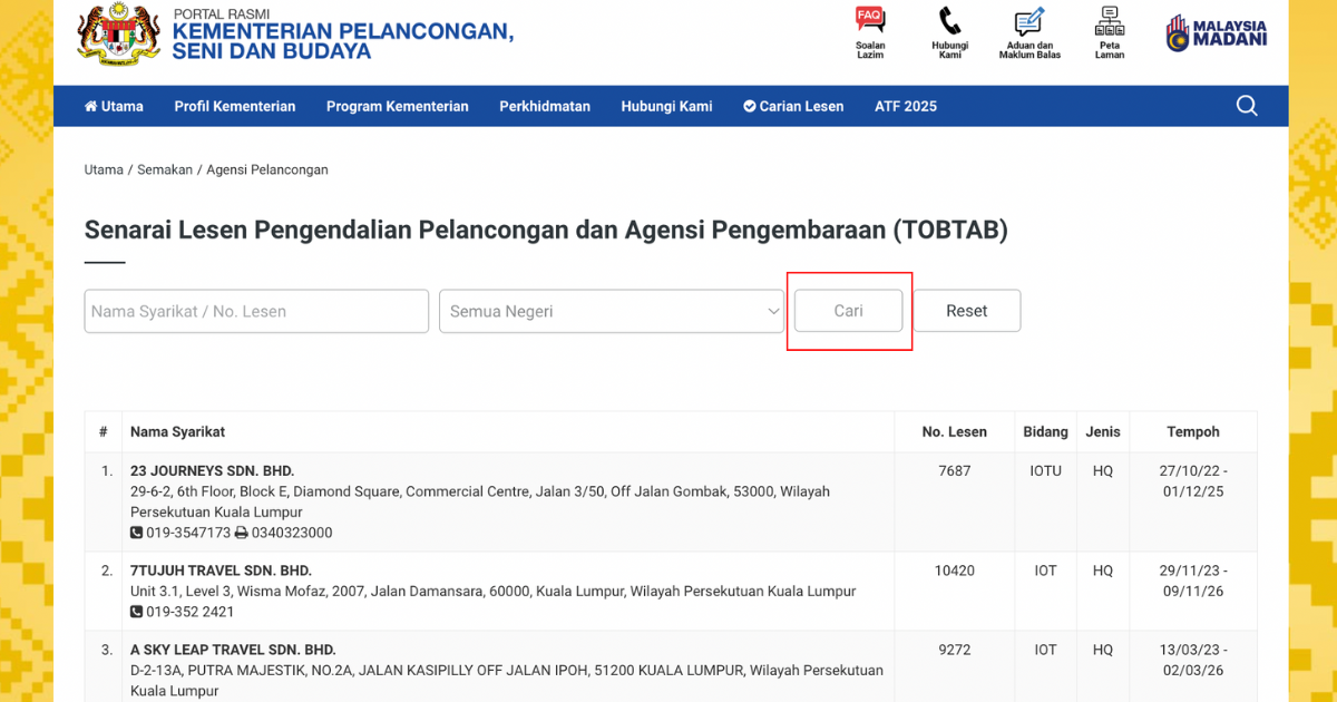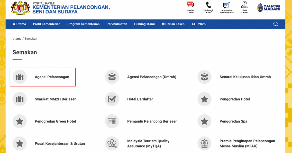 Ikuti langkah-langkah berikut untuk menyemak agensi pelancongan yang berdaftar: