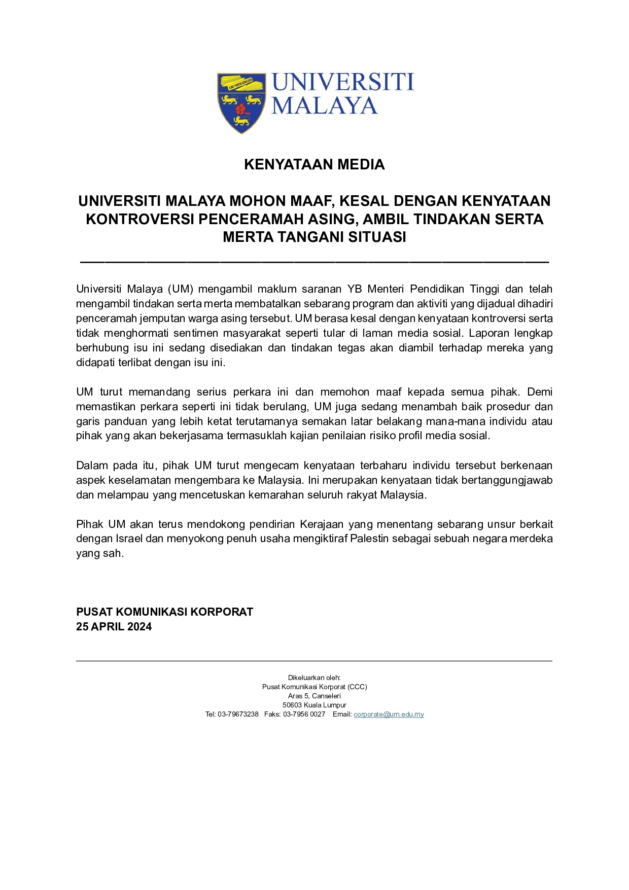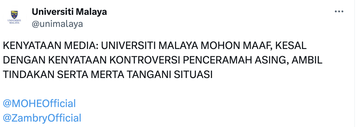 Universiti Malaya dalam satu kenyataan semalam membuat permohonan maaf dan menyatakan kekesalan atas kenyataan kontroversi serta tidak menghormati sentimen masyarakat yang dikeluarkan penceramah jemputan warga asing seperti tular di laman media sosial ketika ini.