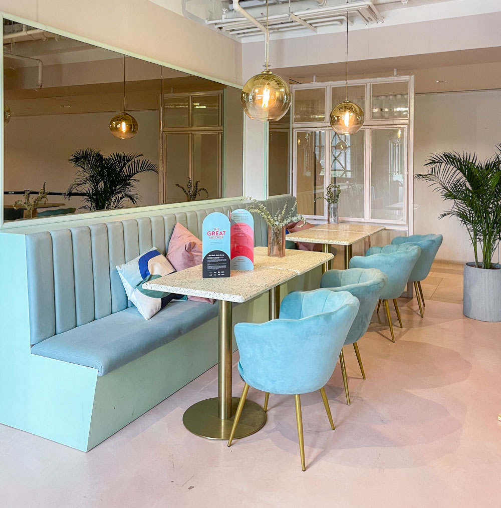 Alami keindahan menjamu selera anda hanya di The Great Mischief yang terletak di National Gallery Singapore. Untuk anda yang pertama kali memasuki restoran ini, anda akan terpukau dengan dekorasi mereka yang cantik dengan hiasan dalaman berwarna pastel, aksen emas dan mempunyai lampu neon beserta jubin biru. Suasana yang segar mempunyai keseimbangan yang baik di antara seni warisan dan moden.