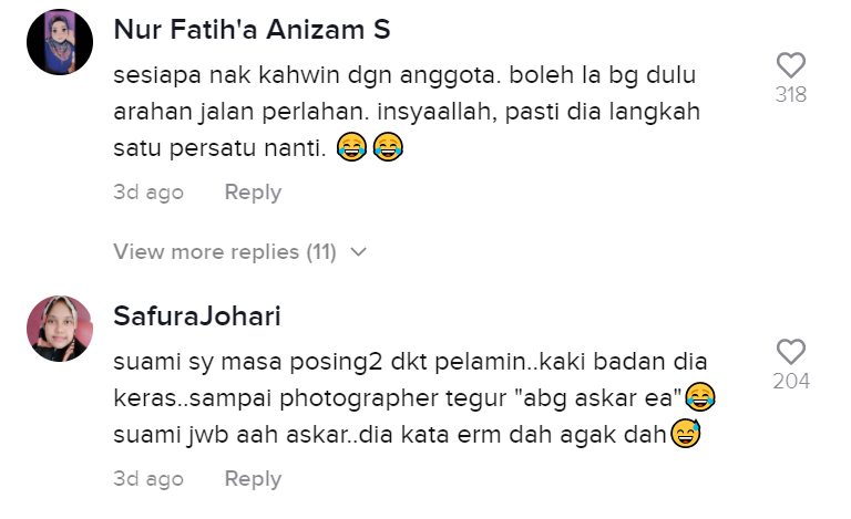 Bila suami kerja askar, sampai berjalan pun ikut cara suami ya 😛