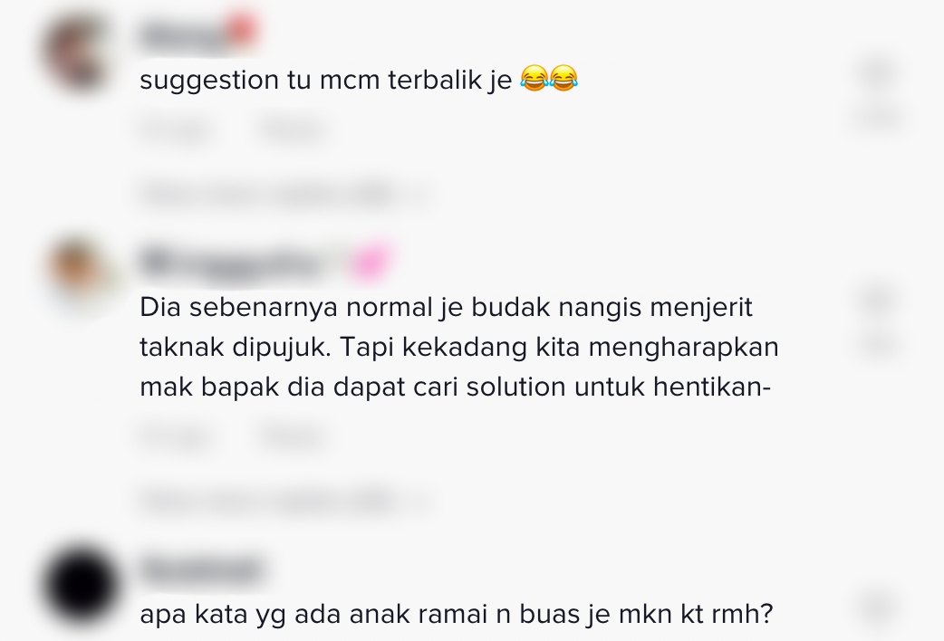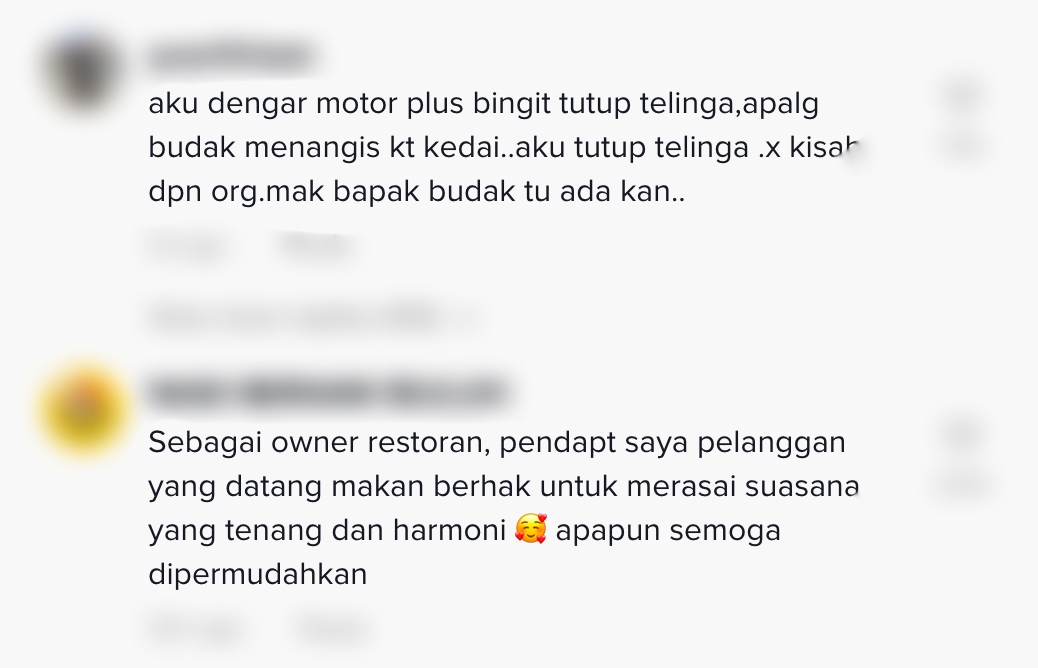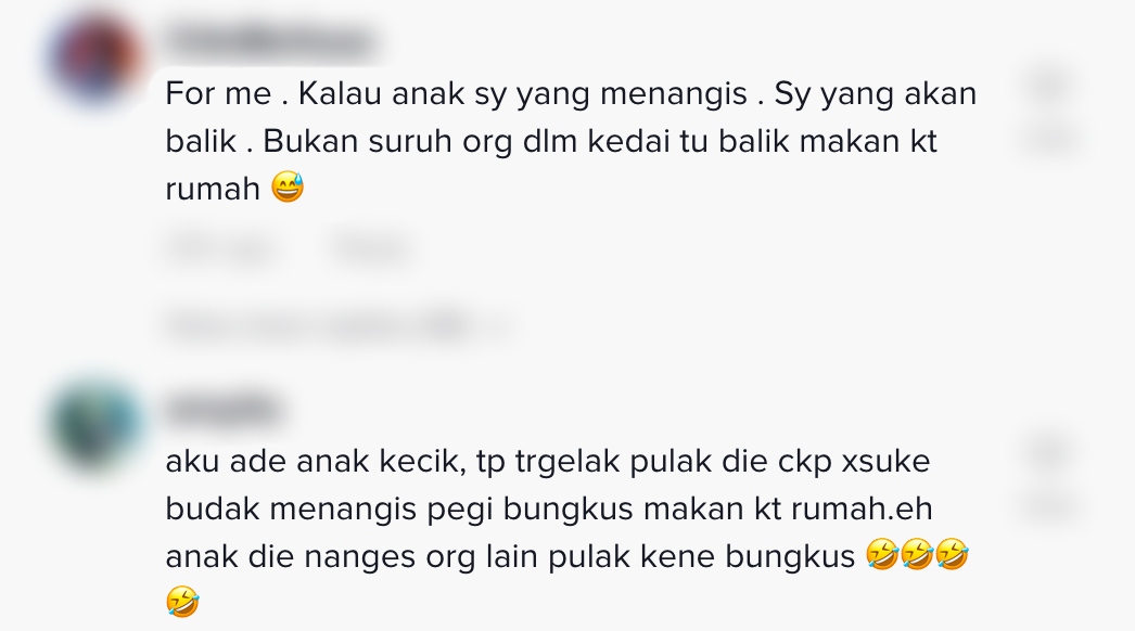"Kalau korang pergi kedai makan ada anak kecil menangis ke apa pleaselah tak payah nak pandang serong. Kalau korang tak suka dengan suasana bising macam tu boleh tak korang makan dekat rumah je," katanya